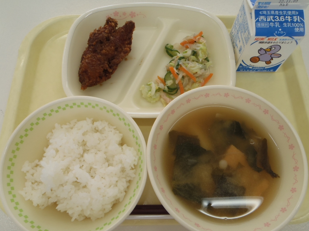 ⭐︎牛乳 ⭐︎ご飯・ふりかけのり ⭐︎さばのしょうが焼き ⭐︎切り干し大根の炒り煮 ⭐︎重忠汁 今日は重忠汁です。 重忠汁は深谷市の郷土料理で、重忠公が幼いころに、うぐいすの瀬というところで、石投げをして遊んでいたことから、白玉団子を石に見立てています。