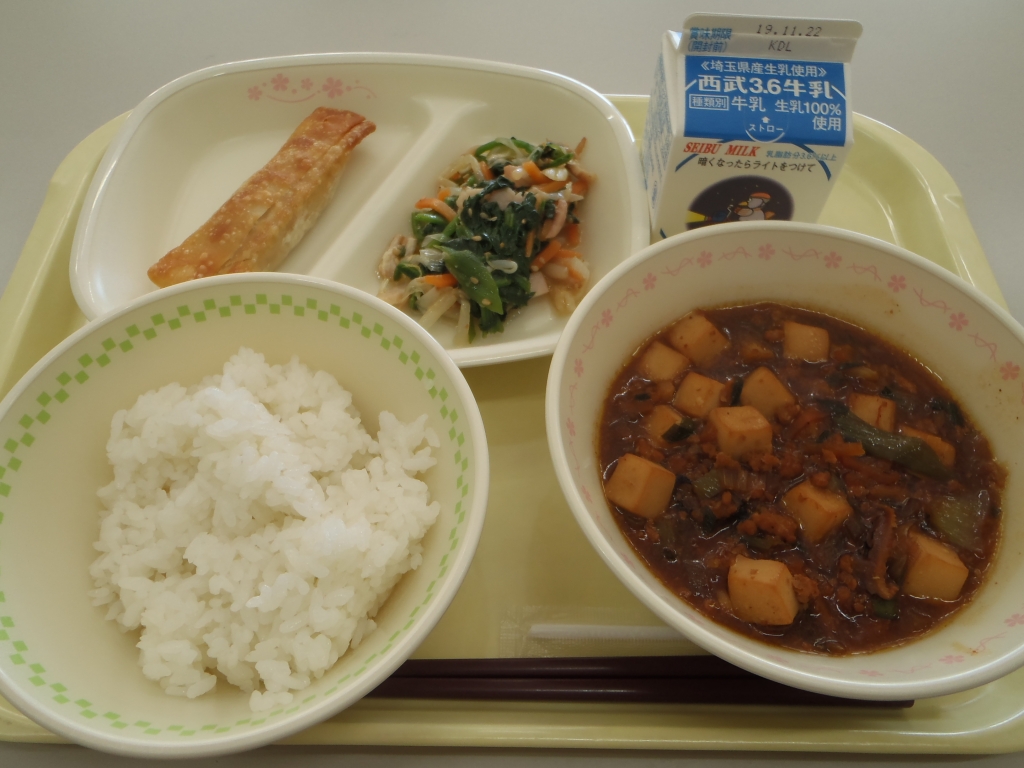 今日の給食は、もやしラーメン、手作り豆腐ドーナツ、チョレギ風サラダでした。 チョレギ風サラダは、ちりめんじゃこやのりが良いアクセントとなっていました。豆腐ドーナツも、中はサクサク、外はカリカリでとてもおいしかったです(^^)