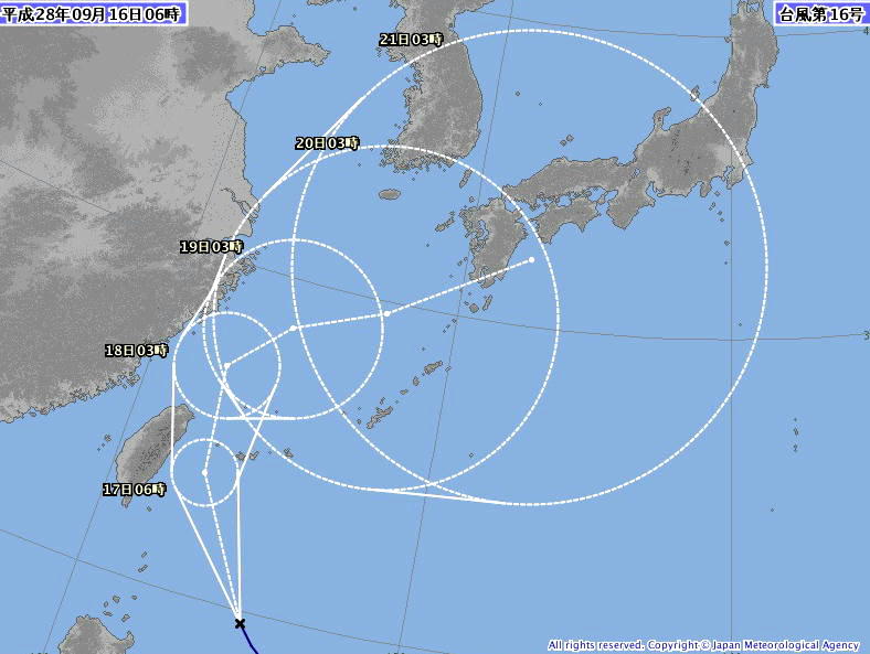 ◆台風16号の進路予想図(気象庁 H28.9.16.AM6:00 現在)