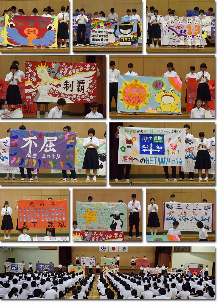 体育委員による生徒集会が行われました。学級旗の紹介と、体育祭に向けての意気込みが語られました。