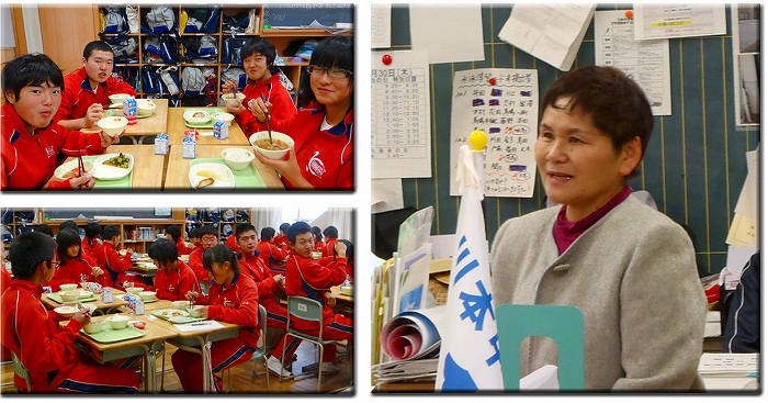 本校は自校給食です。朝早くから生徒のために調理員さんが、給食を作ってくれています。10月24日(水)~11月9日(金)の間は小川さん、11月12日(月)~11月30日(金)の間は、写真の平井さんが、本校の給食室に応援で駆けつけてくれました。 現場経験のあるお二人のおかげで、いつもと変わらず、おいしい給食を食べられることができました。感謝しております。 こんなにおいしい給食が頂ける川中は、本当に幸せですね。