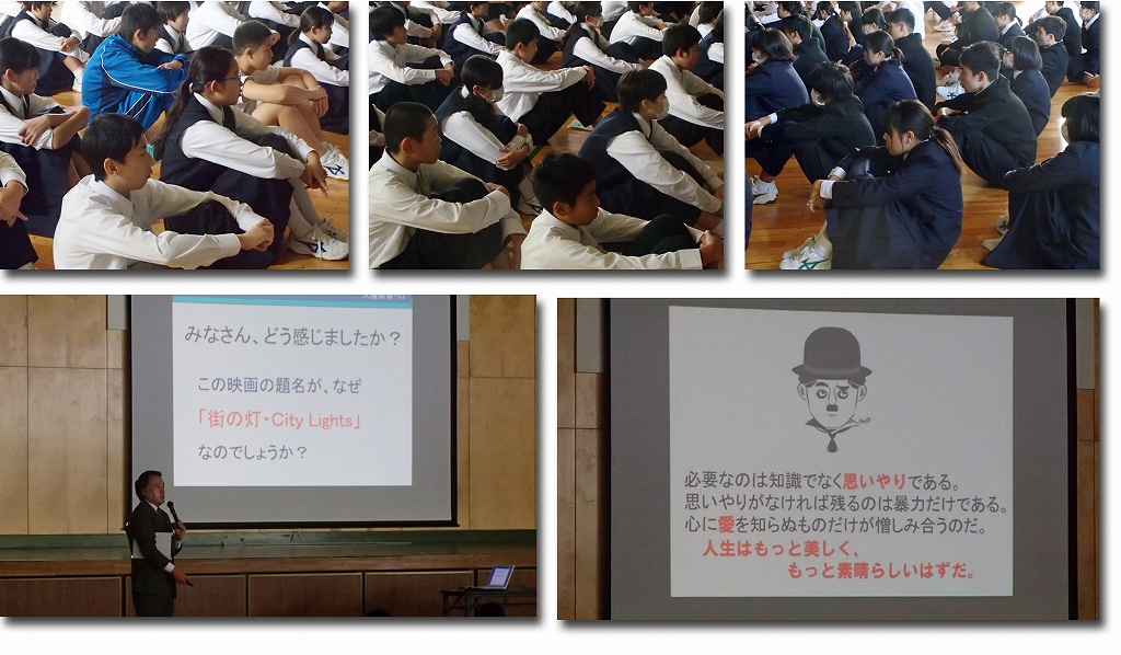 今朝の全校朝会は校長先生より人権講話がありました。みなさん校長先生がおっしゃっていましたが、なぜ今日観た映像の中で、灯が出ていないのに「街の灯」というタイトルかわかりましたか。