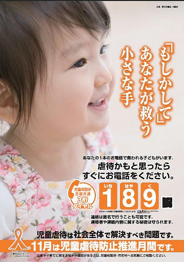 厚生労働省では、毎年11月を「児童虐待防止推進月間」と位置づけ、集中的な広報・啓発を実施しています。厚生労働省HPより 現在、親などによる子どもの虐待が深刻な社会問題になっています。「すべての児童は、心身ともに、健やかにうまれ、育てられ、その生活を保障される」と児童憲章に謳われているようにすべての子どもが虐待を受けずに、健やかに成長できる社会を目指します。(平成27年度標語最優秀作品) 「もしかして」 あなたが救う 小さな手 左見津 真美 さん(兵庫県)の作品
