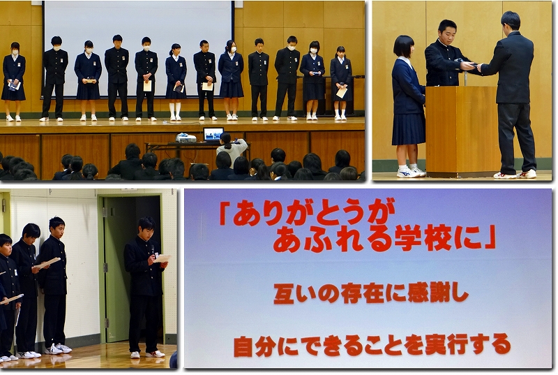 本日8時15分から福祉委員会による全校集会が行われました。「ちょボラ」感謝状とお年寄りの方に送る年賀状コンクールの表彰がありました。「ちょボラ」とは「ちょこっとボランティア」をすることです。また、飛鳥の郷との交流では寄付を贈呈したことなどがあり、その報告がありました。
