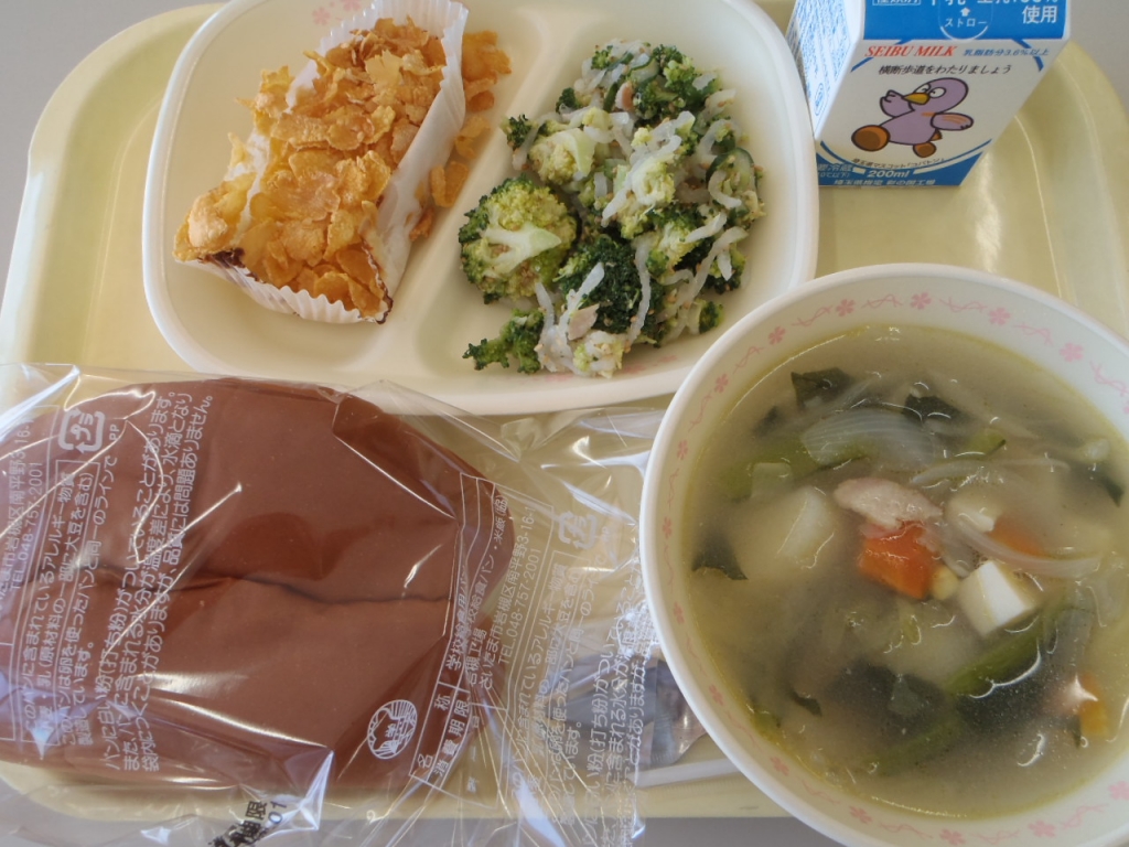 今日の給食は、ご飯、三食そぼろ、ししゃもフリッター、キム豚汁でした。 キム豚汁は、キムチのピリ辛の味がアクセントとなっており、具だくさんでとてもおいしかったです!!