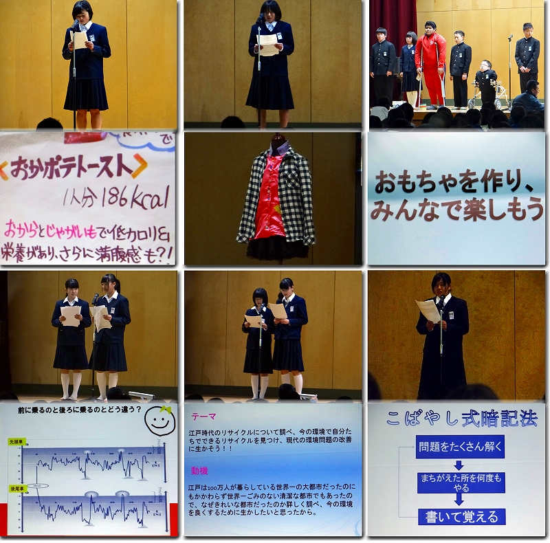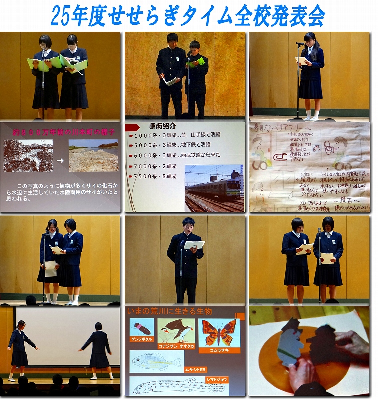 本日2・3・4時間目は総合的な学習せせらぎタイム全校発表会が行われました。川本中近辺の化石についての発表や保育園児の発達段階に応じたおもちゃについての発表などがありました。調べ学習で終わらず、そこから自分自身の考えをふくらませた発表でした。