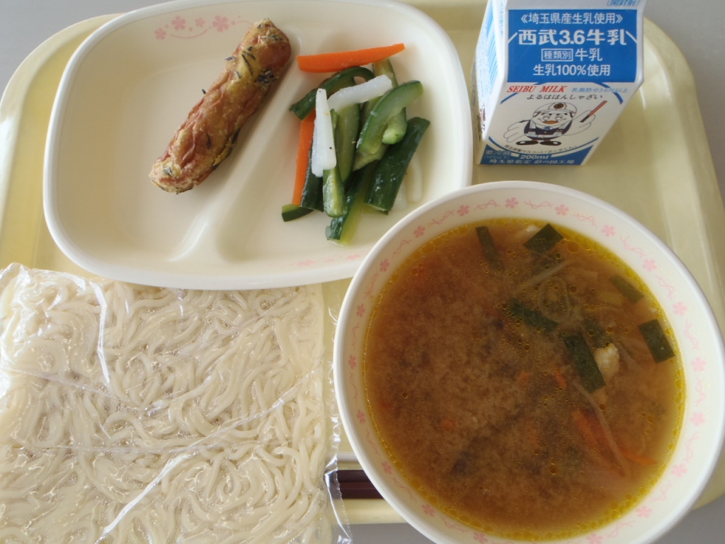 今日の給食は、マーボーラーメン、深谷レンガパンケーキ、春雨サラダでした。 マーボーラーメンは少し辛めのとろとろしたスープで、麺との相性も良く、とてもおいしかったです!(^^)!