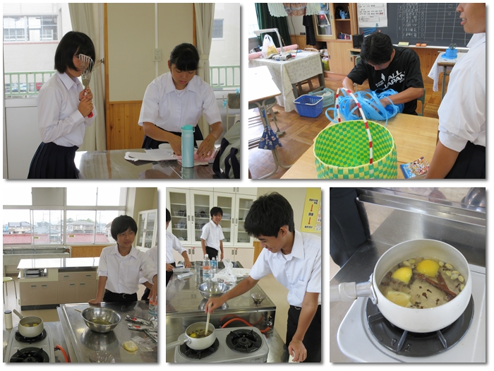 家庭科の調理実習で、ご飯とみそ汁を作りました。いつもは、炊飯器で炊いているお米も鍋で炊くことで火加減の難しさを体感していました。みそ汁では、煮干しで出汁を取りました。普段の食事も自分たちで作ると大変さを実感しているようでした。 とても美味しそうに食...