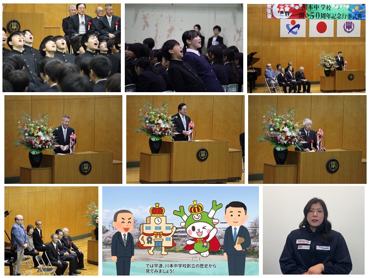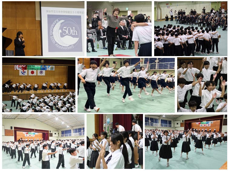 川本中学校の創立50周年記念式典を開催し、深谷市長の小島進様、教育長の片桐雅之様を始めとする多くの御来賓、保護者やPTAの皆様に御臨席いただきました。式典では50年の歴史を振り返る動画を視聴し、卒業生であるパラリンピック金メダリストの村岡桃佳選手からのメッセージもいただきました。生徒たちは学年合唱、あらかわっ子の歌、全校ダンスを披露し、50周年のお祝いに花を添えました。